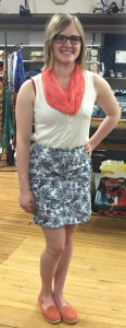 Keren Hart sleeveless tee with lace overlay, New Company infinity scarf, Renuar skirt and OluKai laser cut leather shoes.